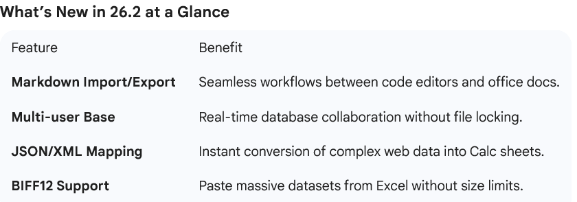 The release notes for 26.2 highlight a major win for data nerds: JSON and XML mapping in Calc. This allows users to open a nested JSON file and have LibreOffice automatically flatten it into a 2D spreadsheet.